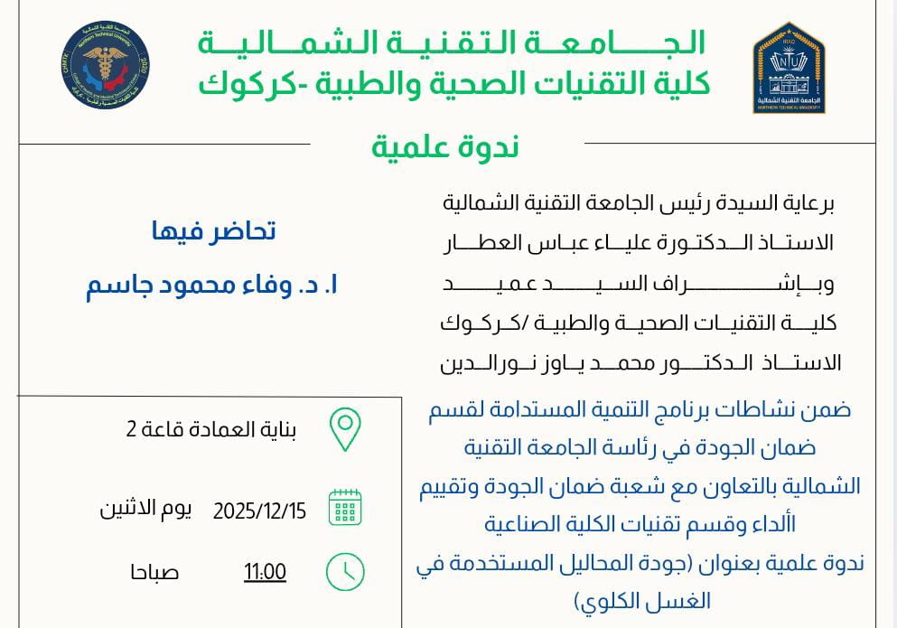 برعاية السيدة رئيس الجامعة التقنية الشمالية الاستاذ الدكتورة علياء عباس العطار وباشراف عميد كلية التقنيات الصحية والطبية الاستاذ الدكتور محمد ياوز نور الدين